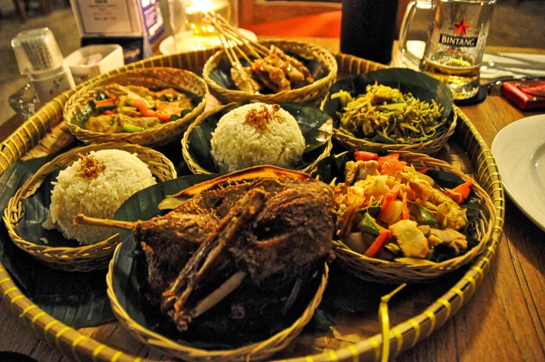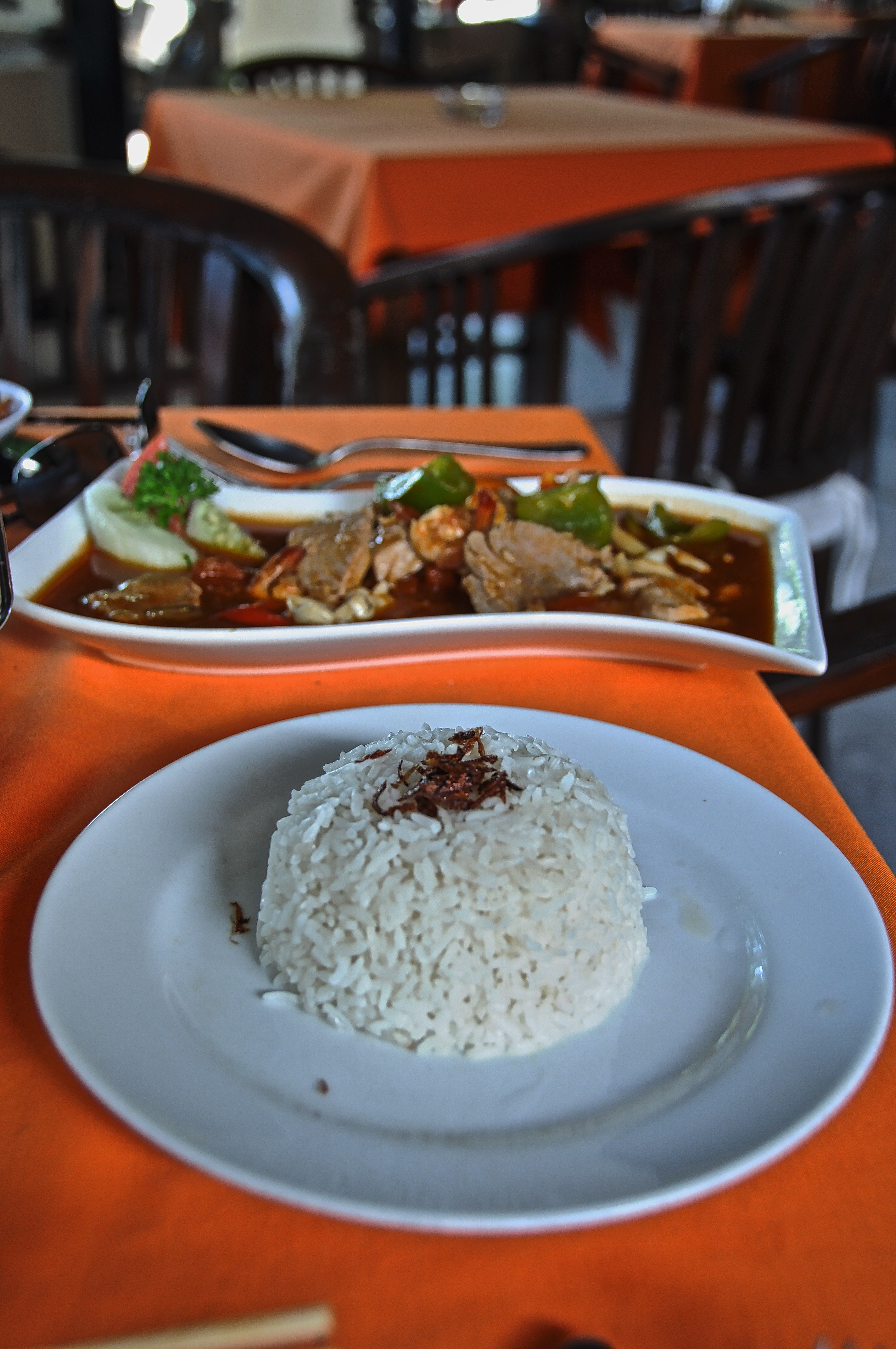 A typical meal consists of rice and small portions of meat and vegetables for about $5.