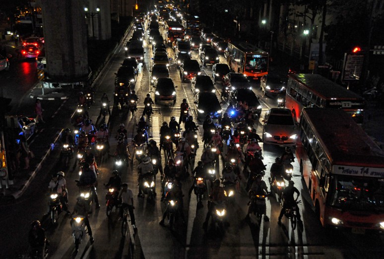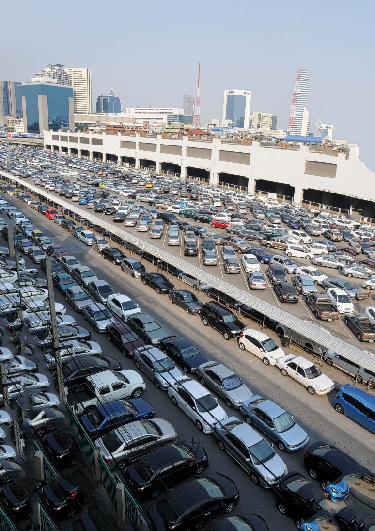 Looking down at paralyzed vehicles on Thanon Sukhumvit street.