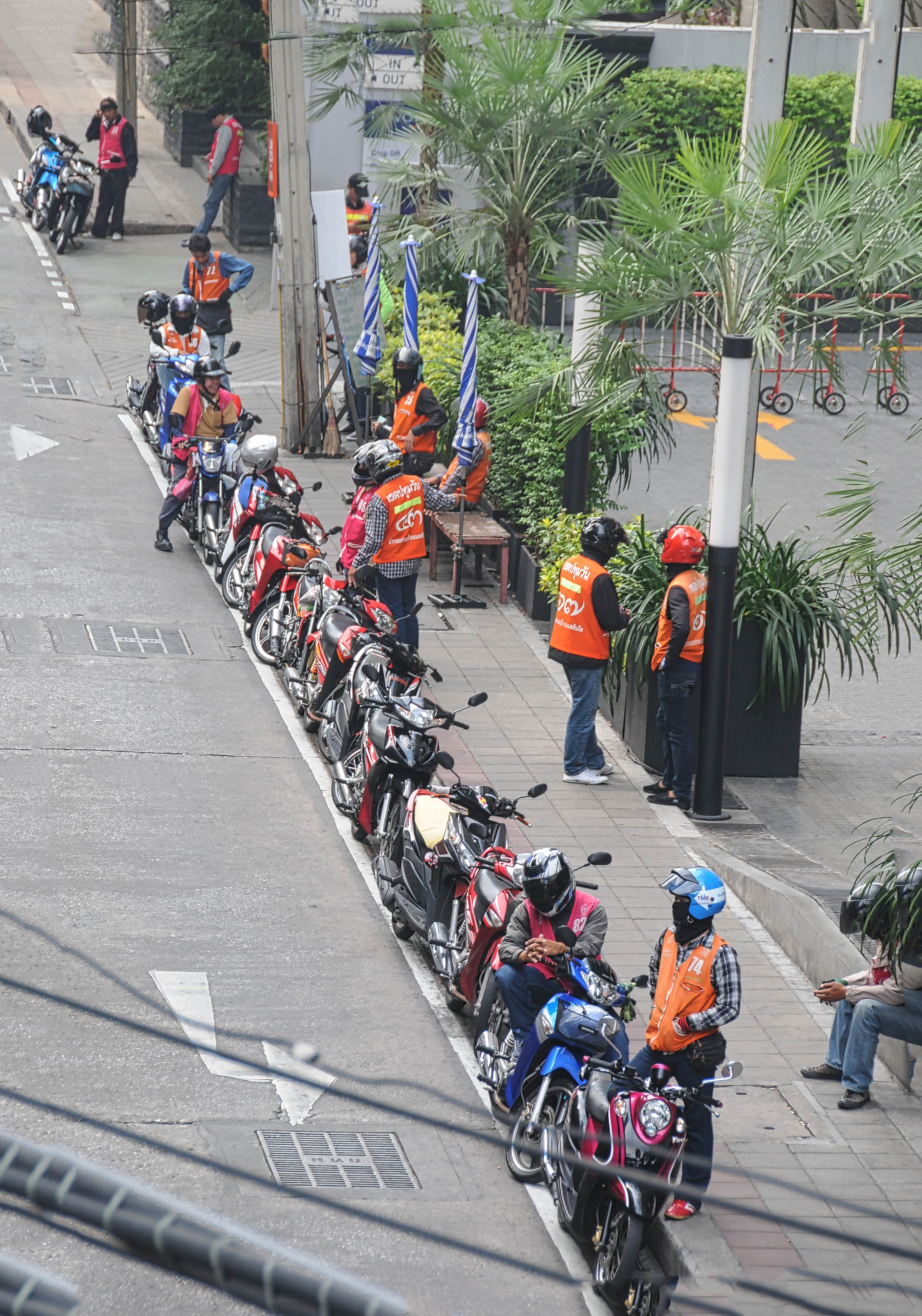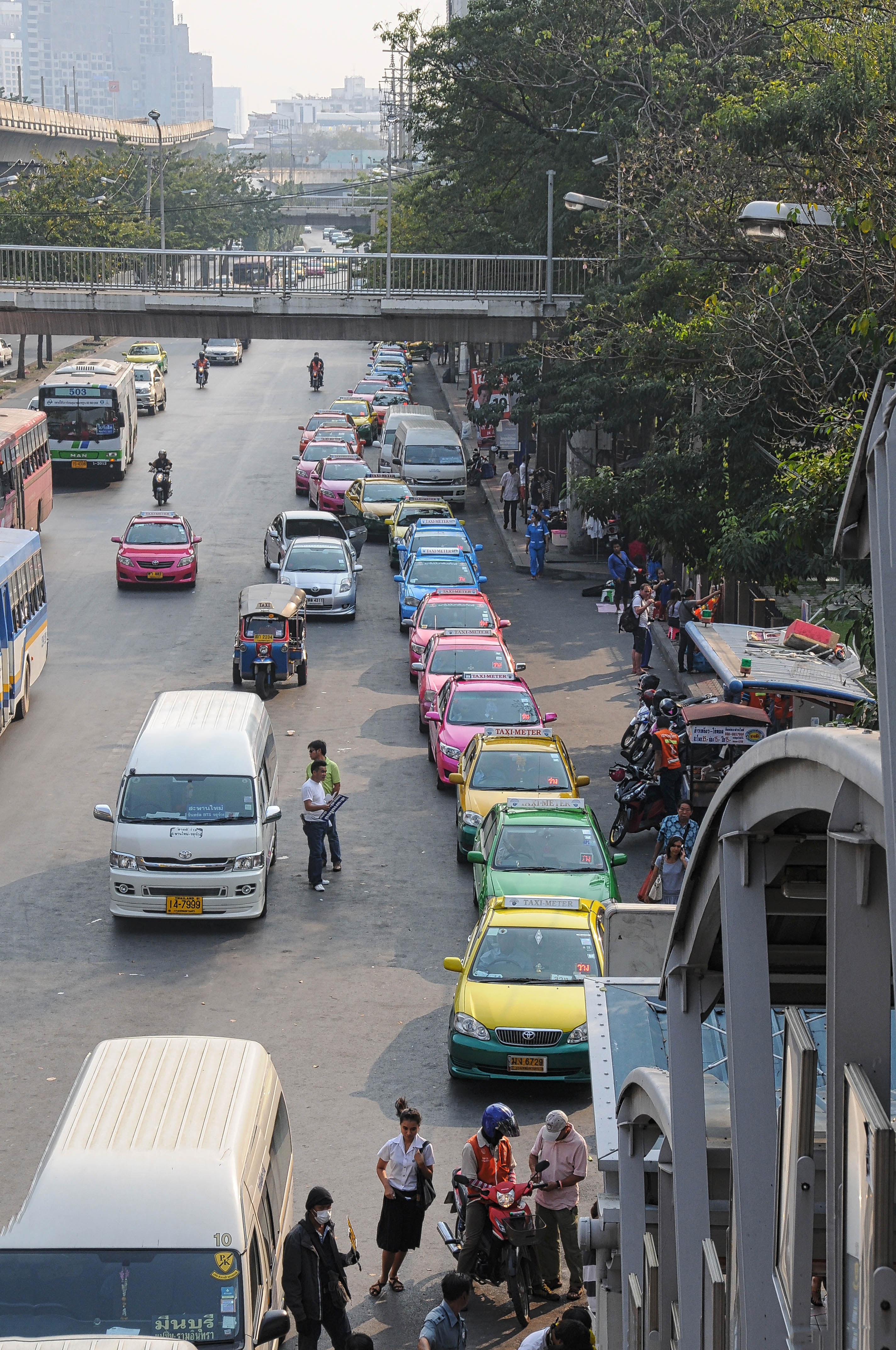 Taxicabs line up outside the “Mo Chit” LRT station. These cabs circled a whole block with engines running. This is where Bangkok needs to add bus routes from the station to alleviate smog and traffic. If indeed there were buses, I didn’t see them.