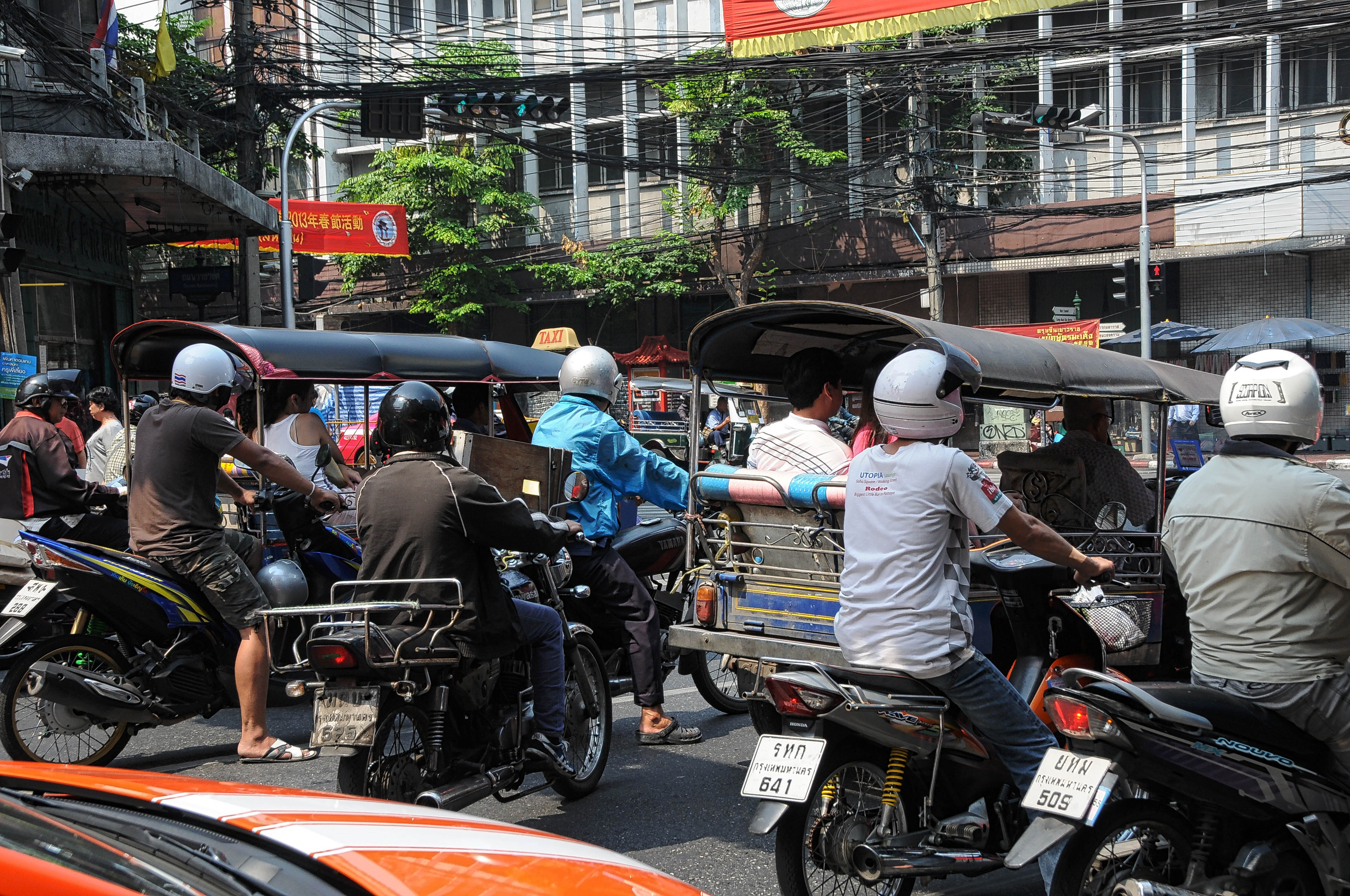 Congested mix of cars, motorbikes and tuk tuks in Chinatown.
