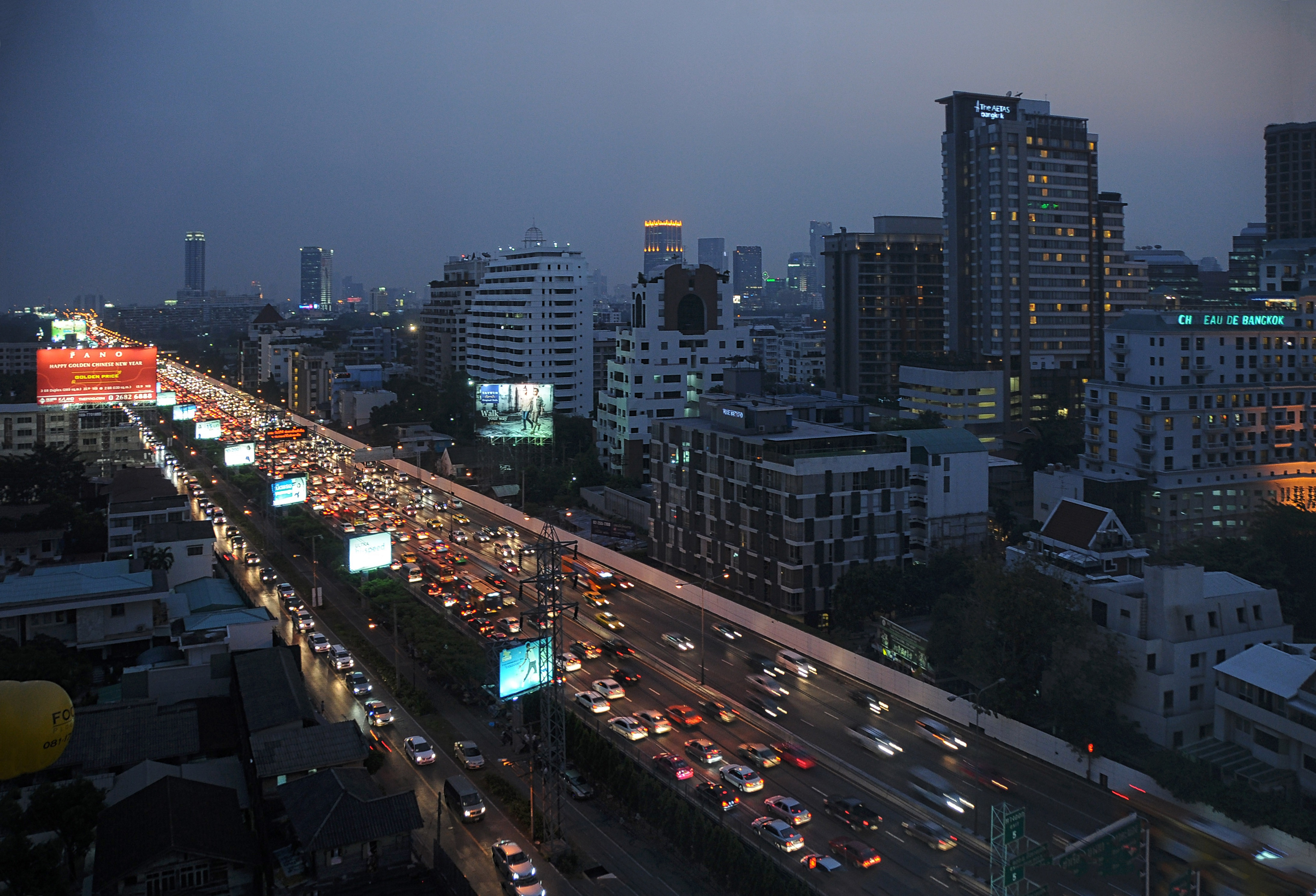 Looking down at paralyzed vehicles on Thanon Sukhumvit street.