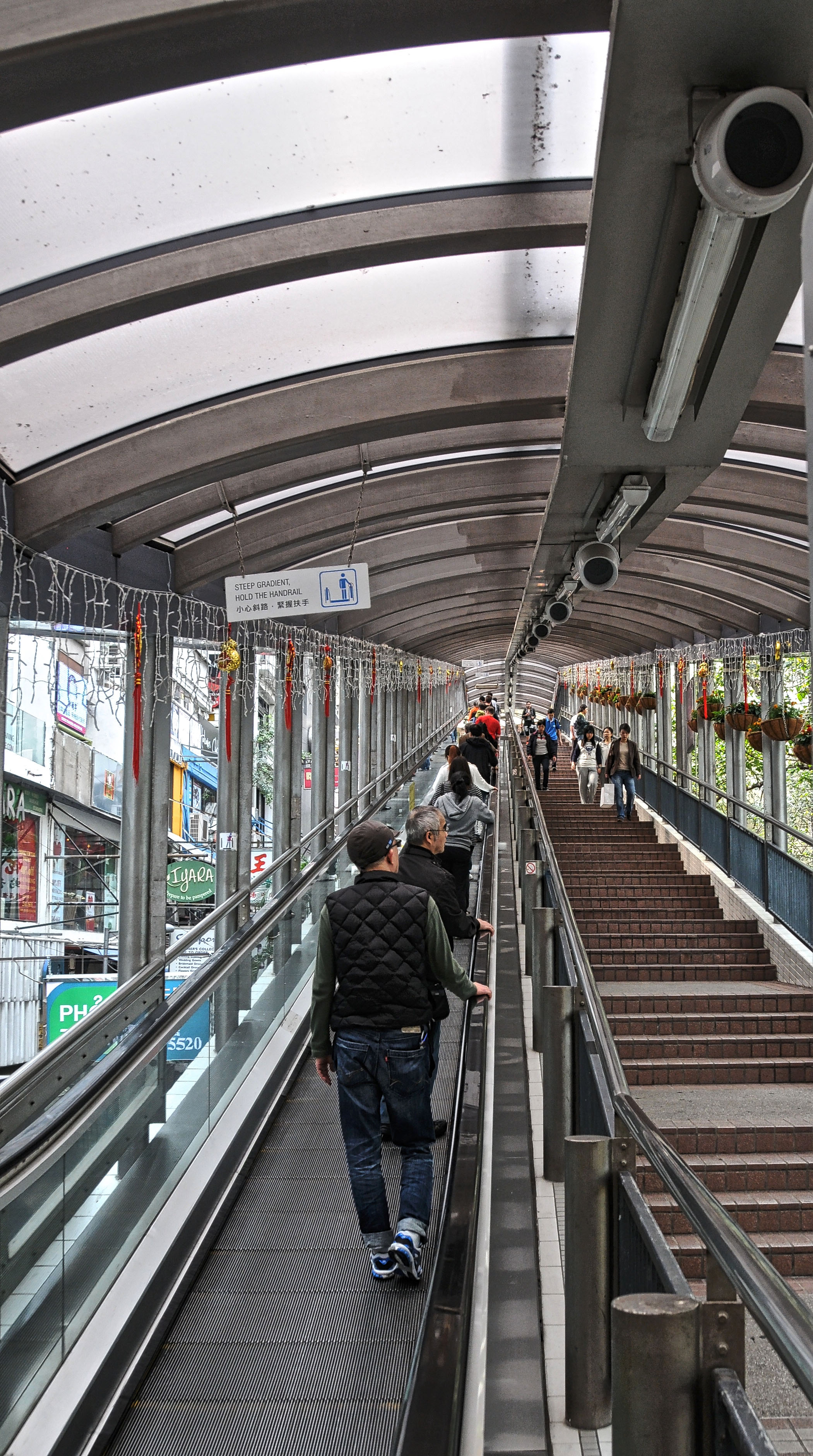 The escalators are 800 metres (2,600 ft) long with a vertical climb of 135 metres (443 ft). It consists of twenty escalators and three moving side-walks. This outdoor covered escalator system is the longest according to the Guiness World Records.