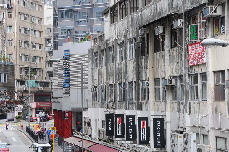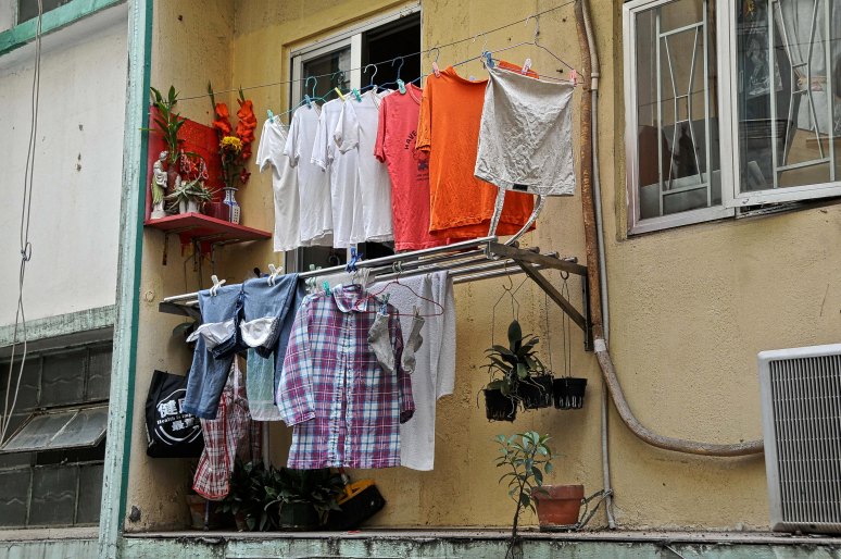 Two common sights in Hong Kong. Air drying clothes and a small shrine (the flowers to the left of the clothes)