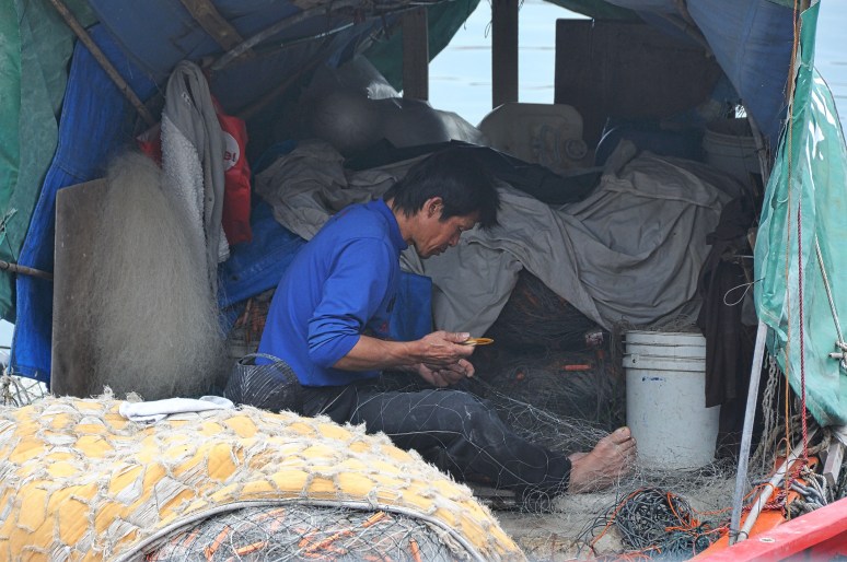 A fisherman repairing a broken net at Cheung Chau Island