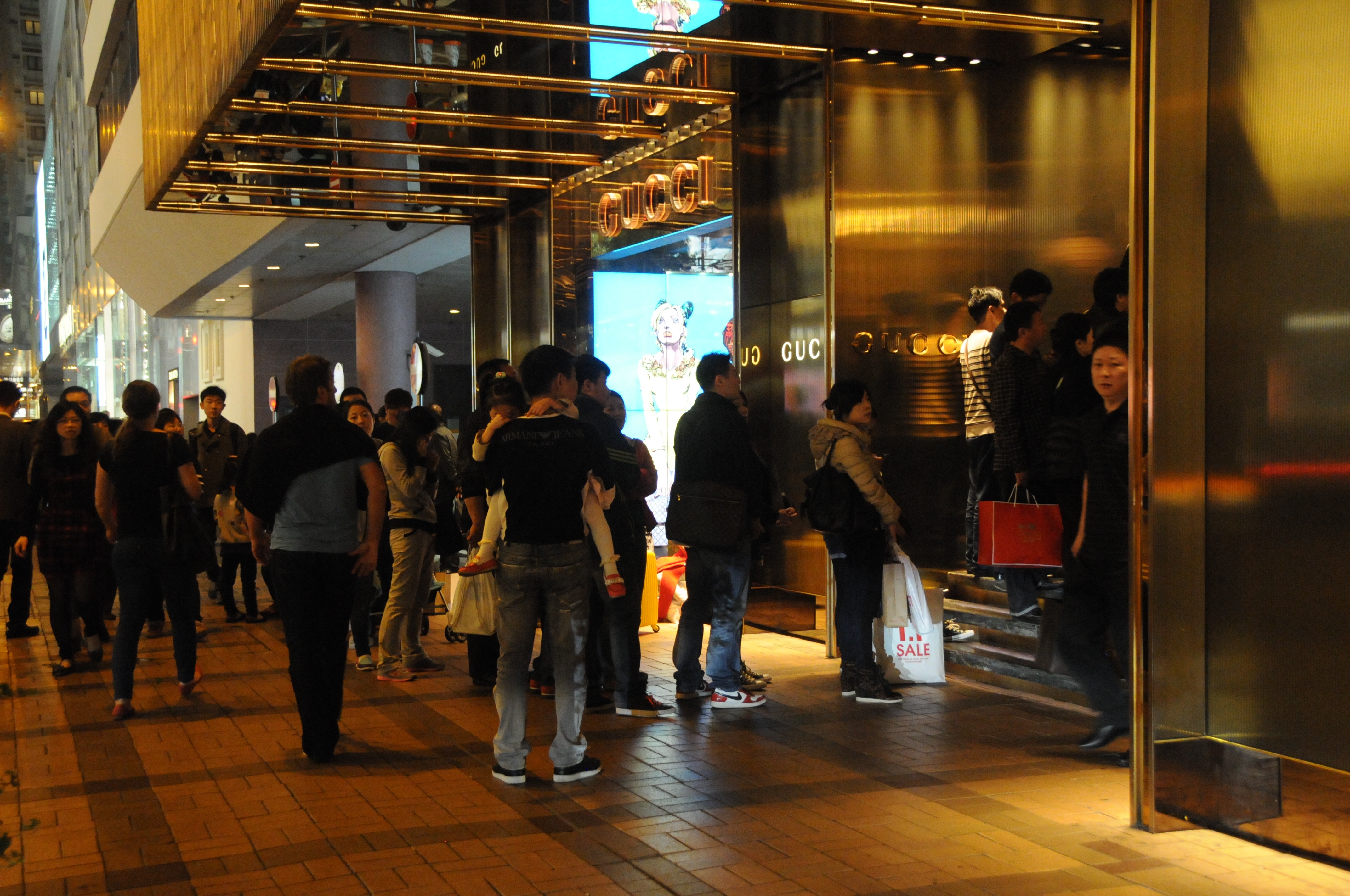 People waiting in line to enter high end stores.