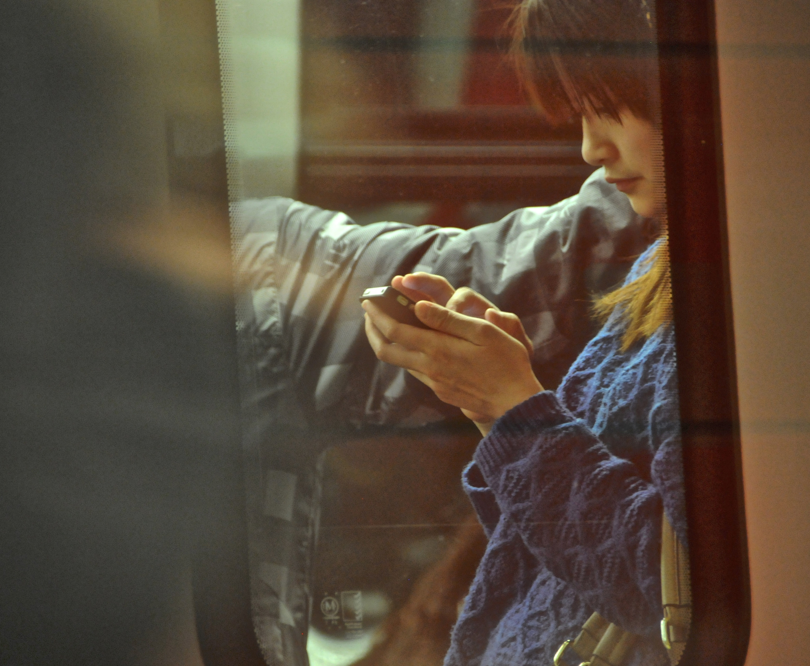 Texting or playing a game to help pass the time on a transit train