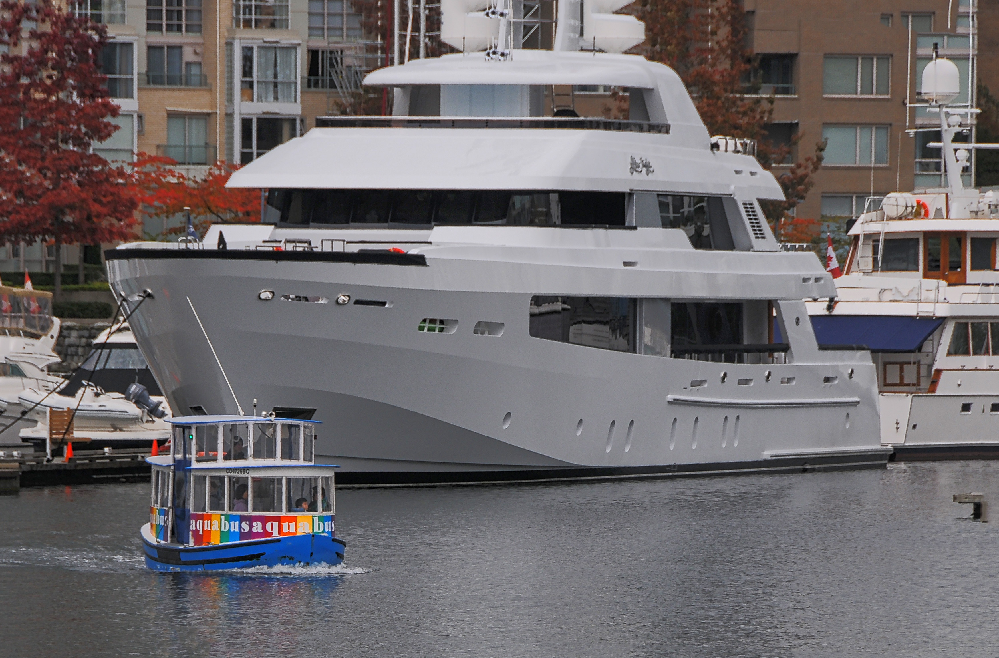 An Aquabus being dwarfed by a yacht