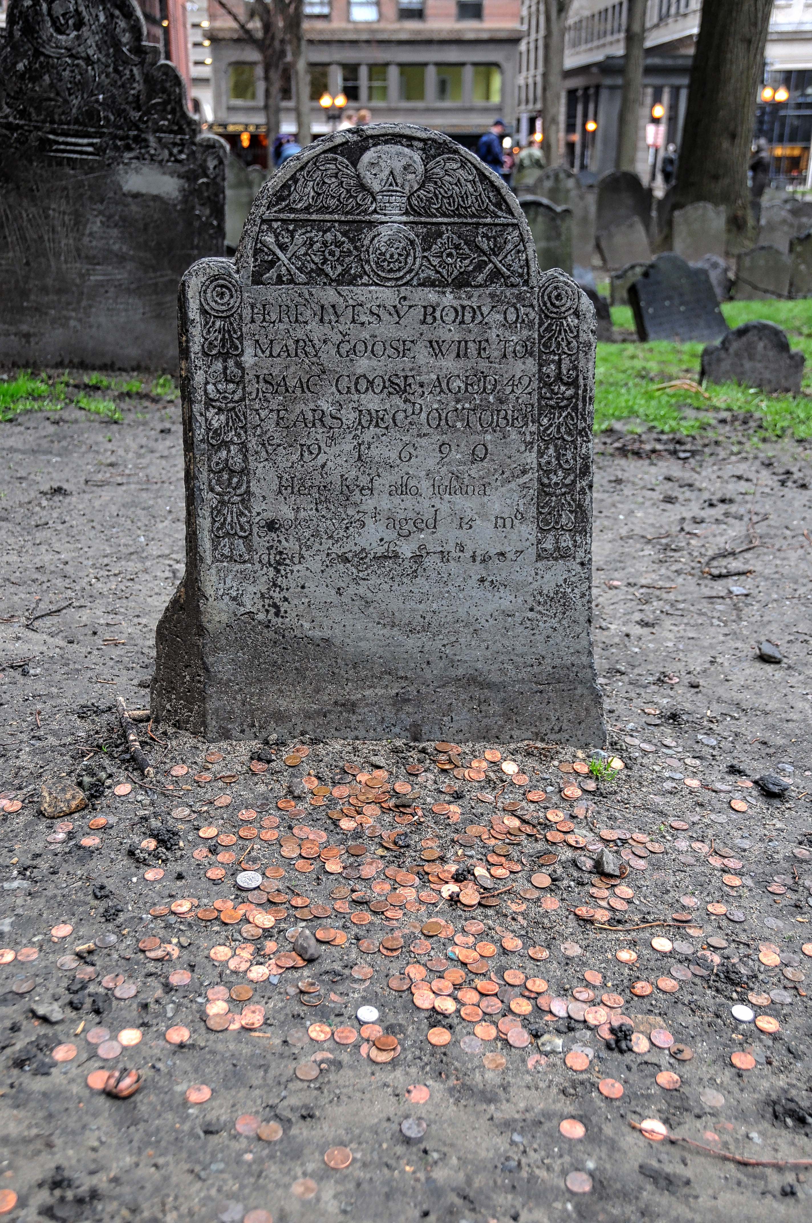 “HERE LYES Y BODY OF MARY GOOSE WIFE TO JSAAC GOOSE; AGED 42 YEARS DEC’D OCTOBE Y 19, 1690”