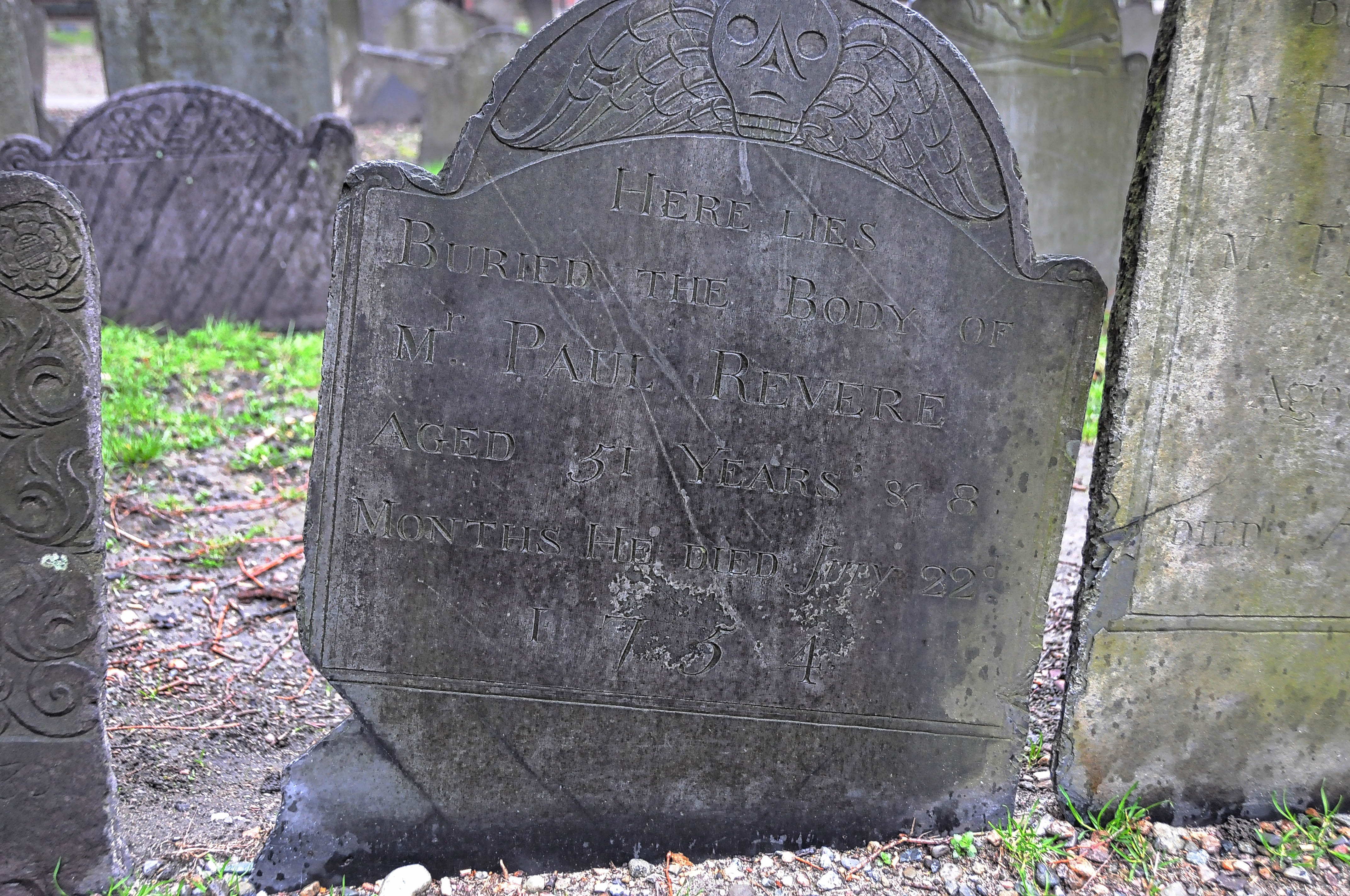 “HERE LIES BURIED THE BODY OF MR PAUL REVERE AGED 31 YEARS & 8 MONTHS HE DIED JULY 22, 1754”