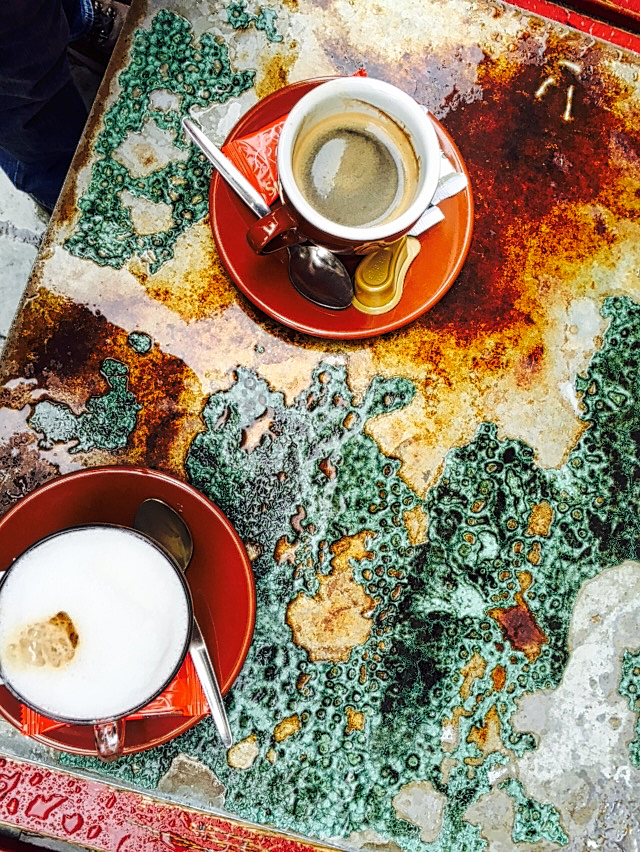 Macchiato and Espresso at a corner coffeeshop in Brussels. I wish I would have recorded the name of the coffeeshop where we got these drinks. After the rain, the outdoor space appeared so much more colourful.