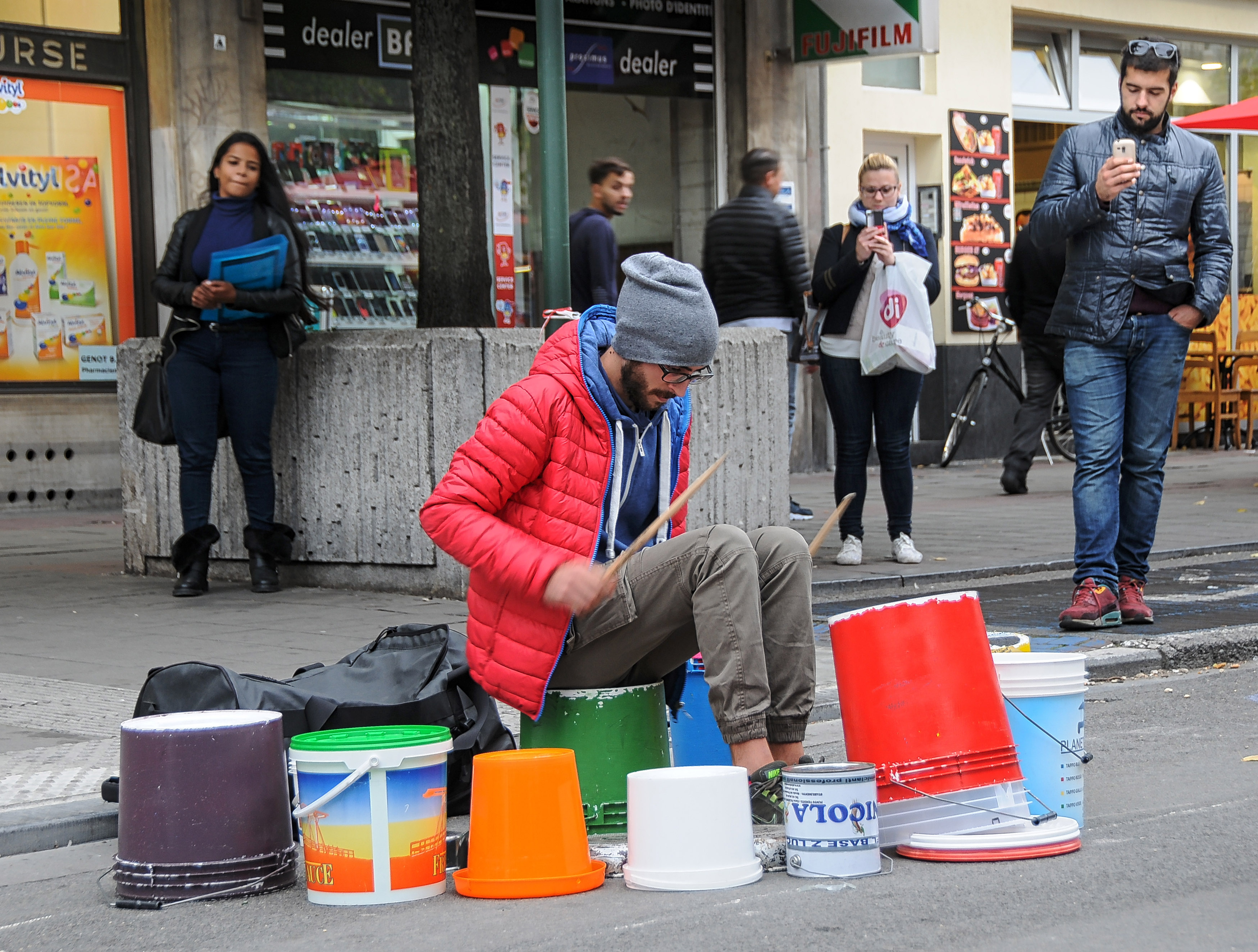 A creative drumming busker displays his talents