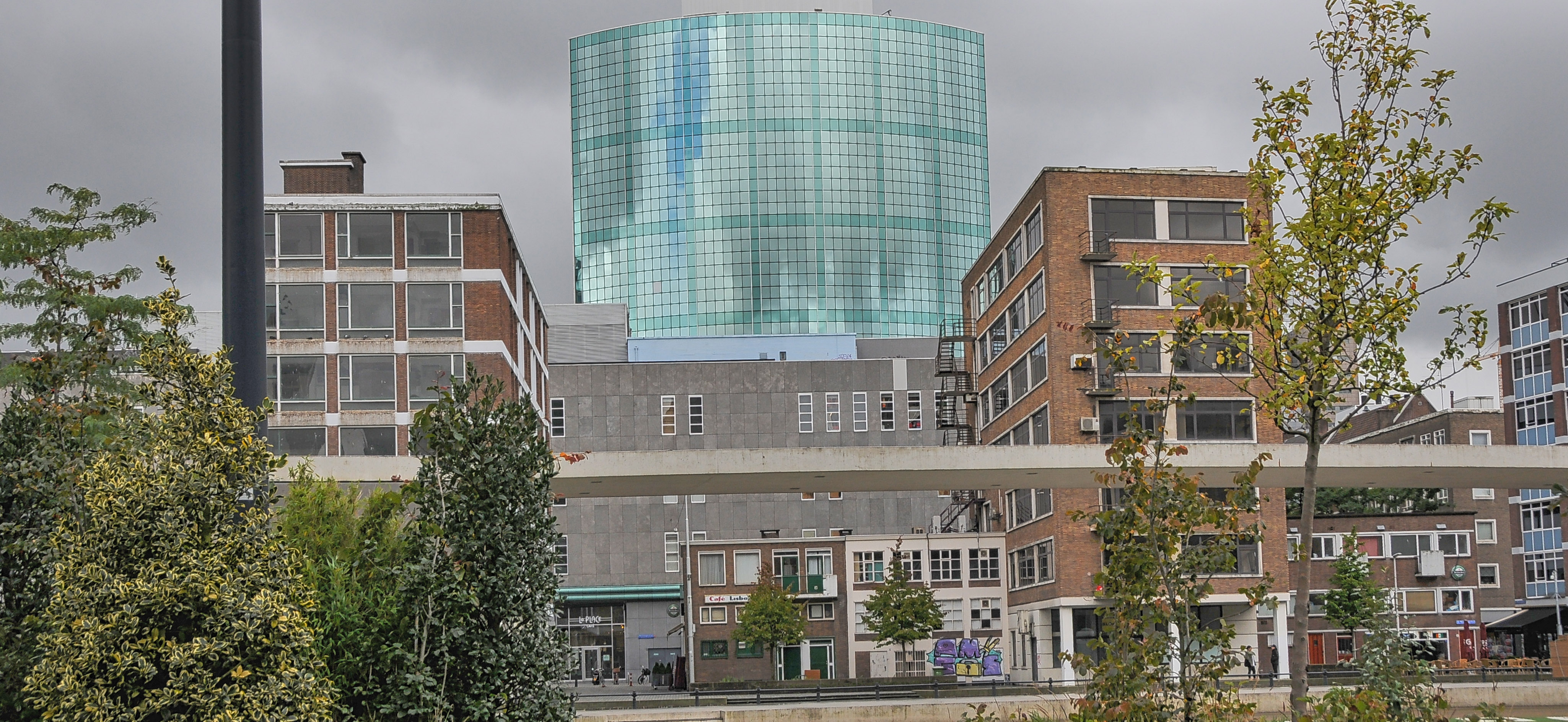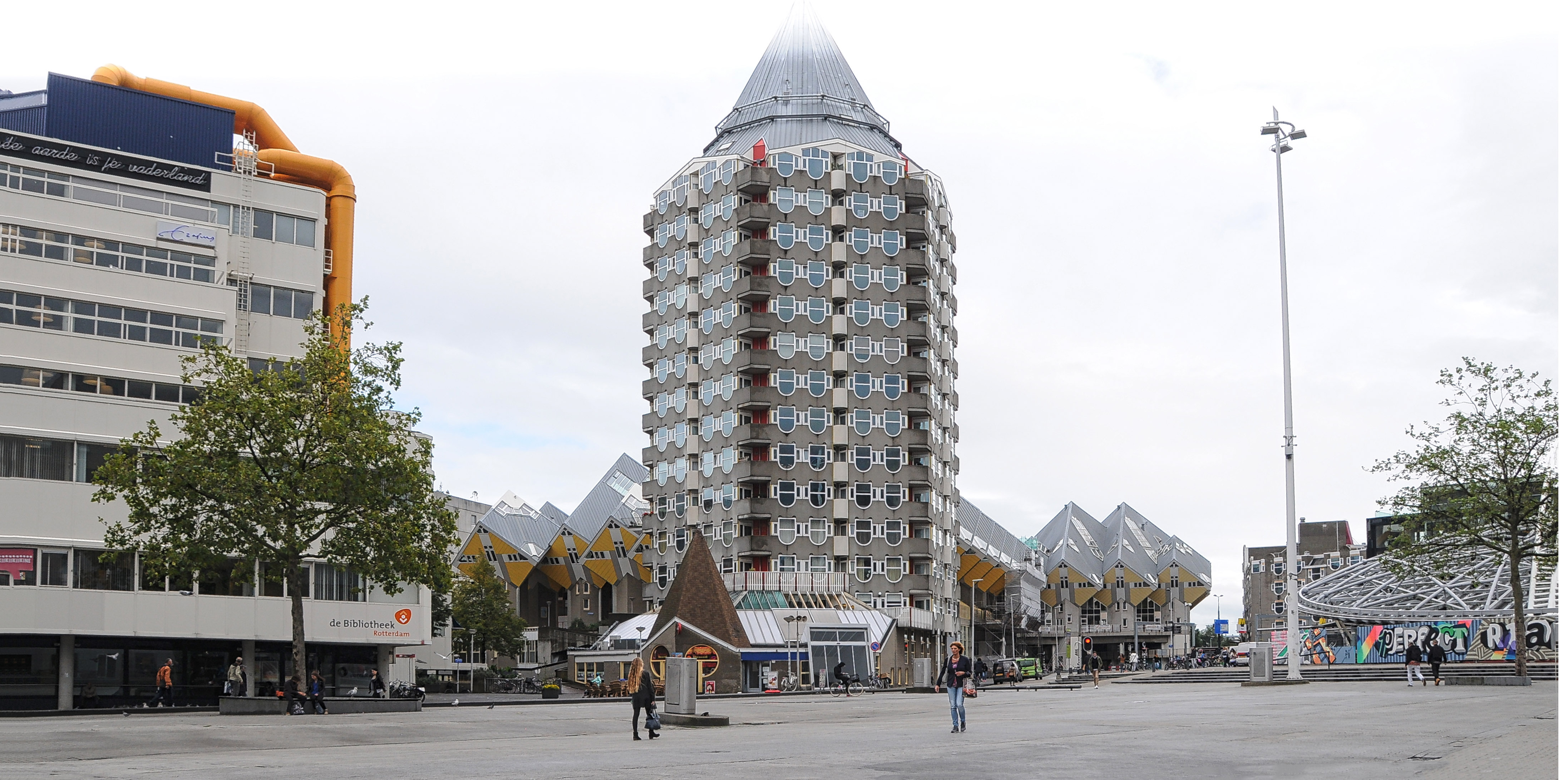 l to r. Rotterdam Public Library, Het Potlood (The Pencil), Rotterdam Station Blaak (with the circular structure) and Markthal