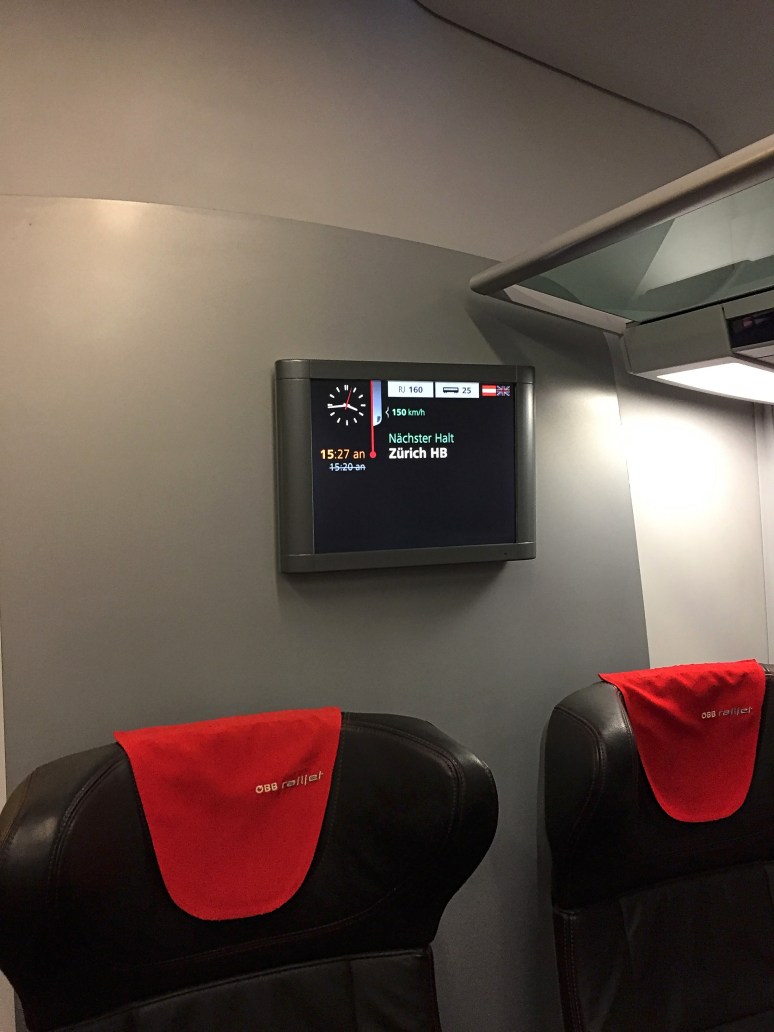 A shot of our last day of train rides, as we approach Zurich HB. The great thing about these video displays is that they make sure you know where you are. Zurich HB means the final destination, RJ160 is the train number, 25 means the car that you are in, 150km/h means the speed you are travelling, 15:27 means the expected time of arrival which obviously shows that we are late.