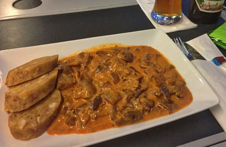 Mushroom Goulash with fried sliced bread dumplings. A late evening meal on the train as we make our way back to Vienna from Salzburg.