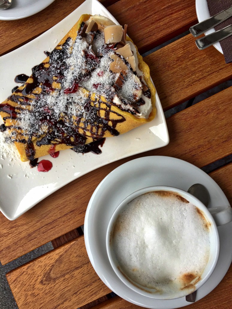 Delicious crepe dessert and Cappuccino in Ljubljana. The waitress did a great sell job convincing me that I should indulge