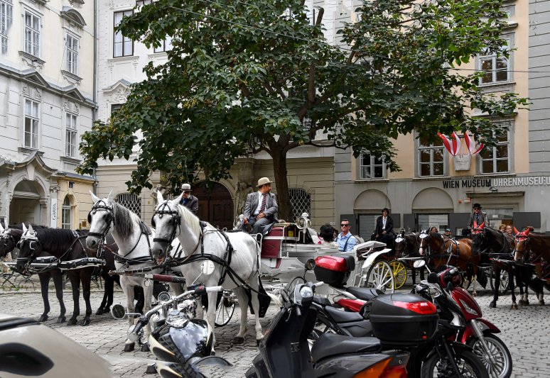 Horse drawn carriages line up outside the Albertina Museum