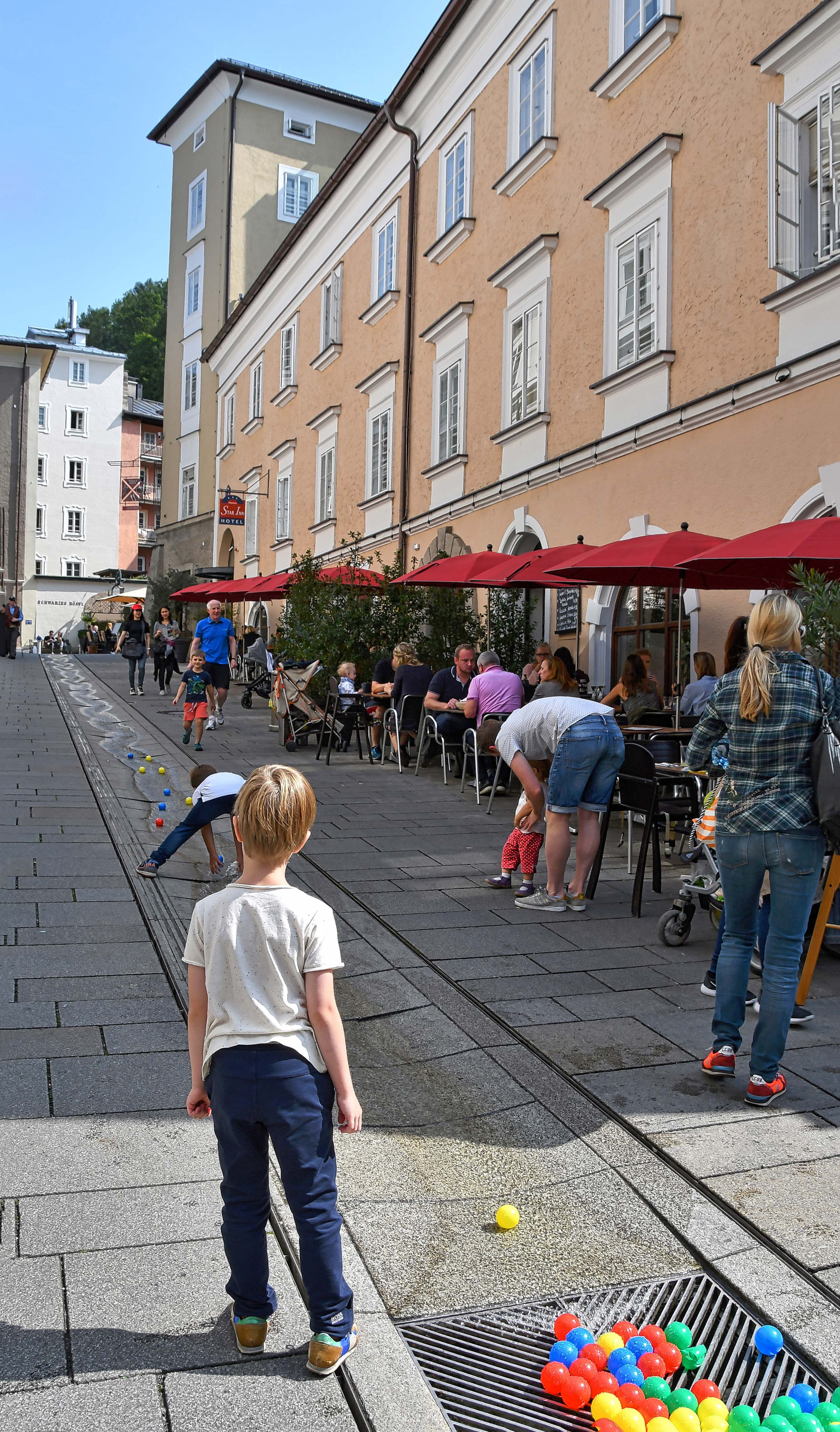 On Dreifaltigkeitsgasse and Richard-Mayr-Gasse, in front of Star Inn Hotel, is a watery incline to accommodate rain drainage and creative child’s activity.