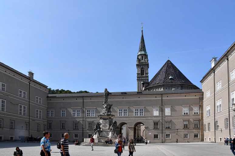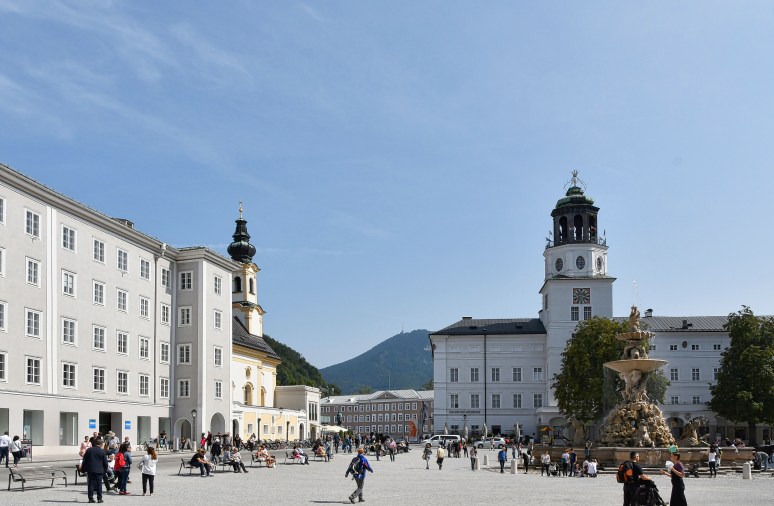 Residenzplatz with Neugebaude (white building) with Glockenspiel and the marble fountain called Residenzbrunnen. The Glockenspiel has 35 bells that plays tunes from Mozart’s repertoire three times a day.