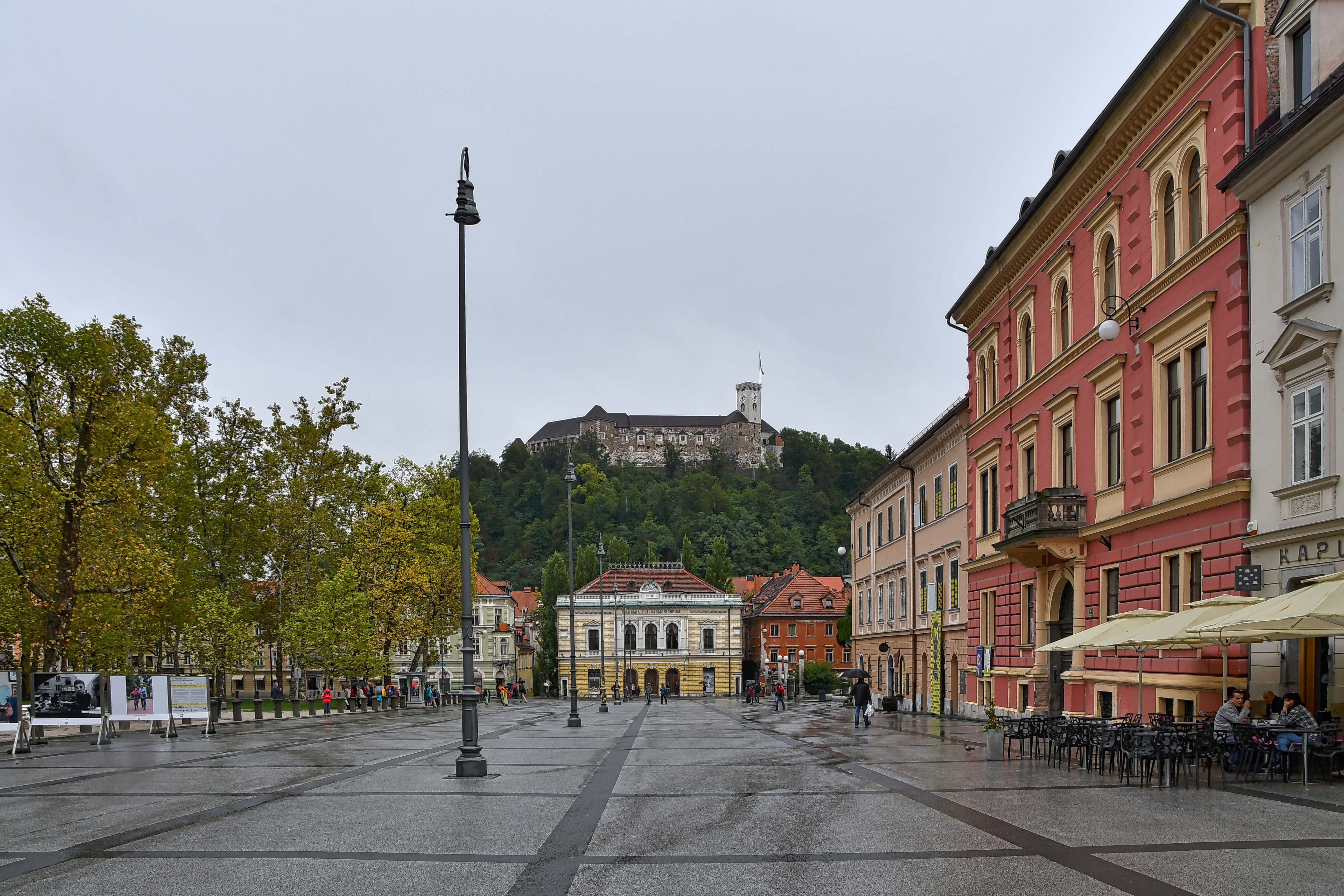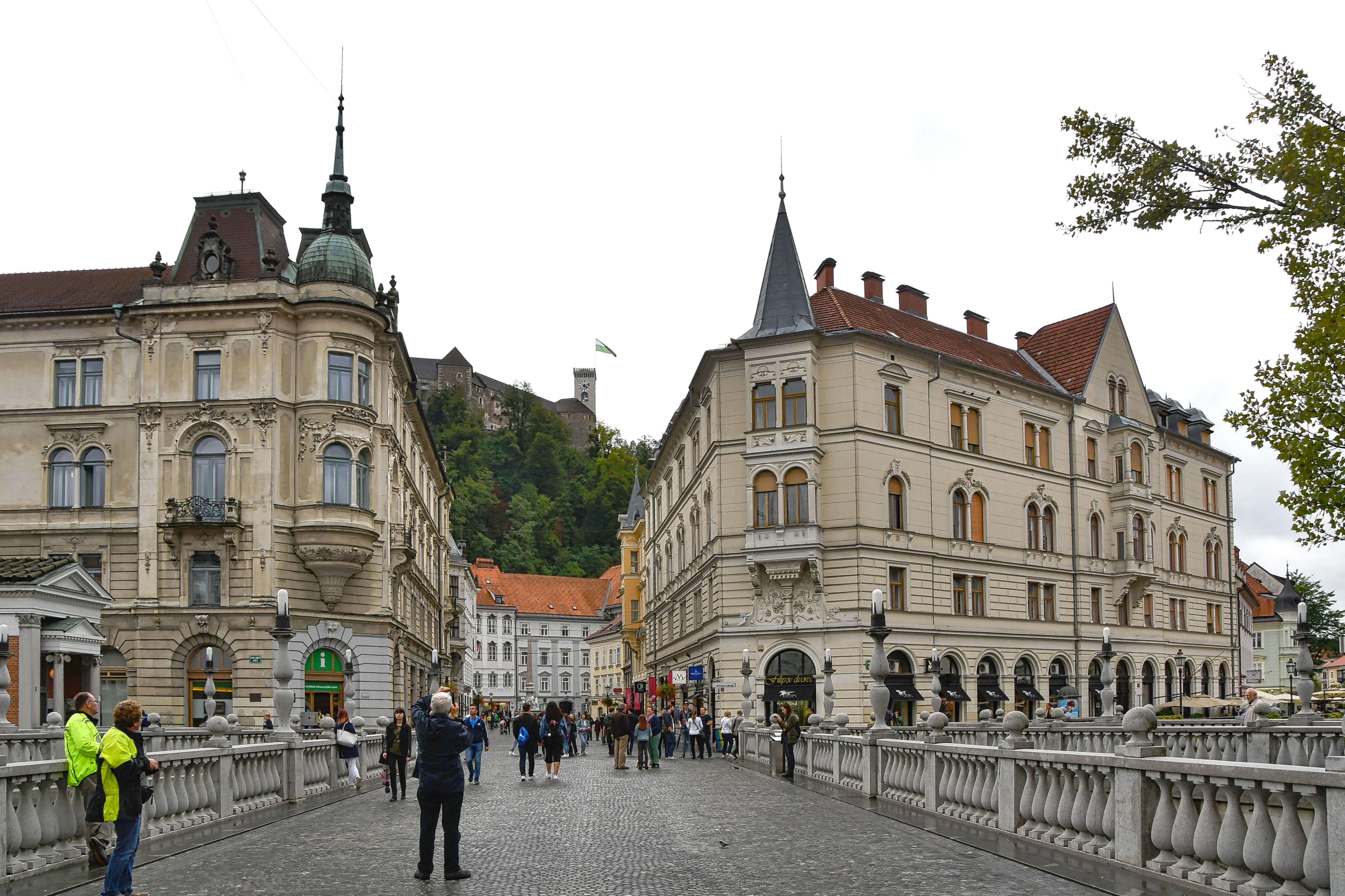 We look east to Ljubljana Castle. The coffeeshop to the right of this photo was a great place for an espresso stop.