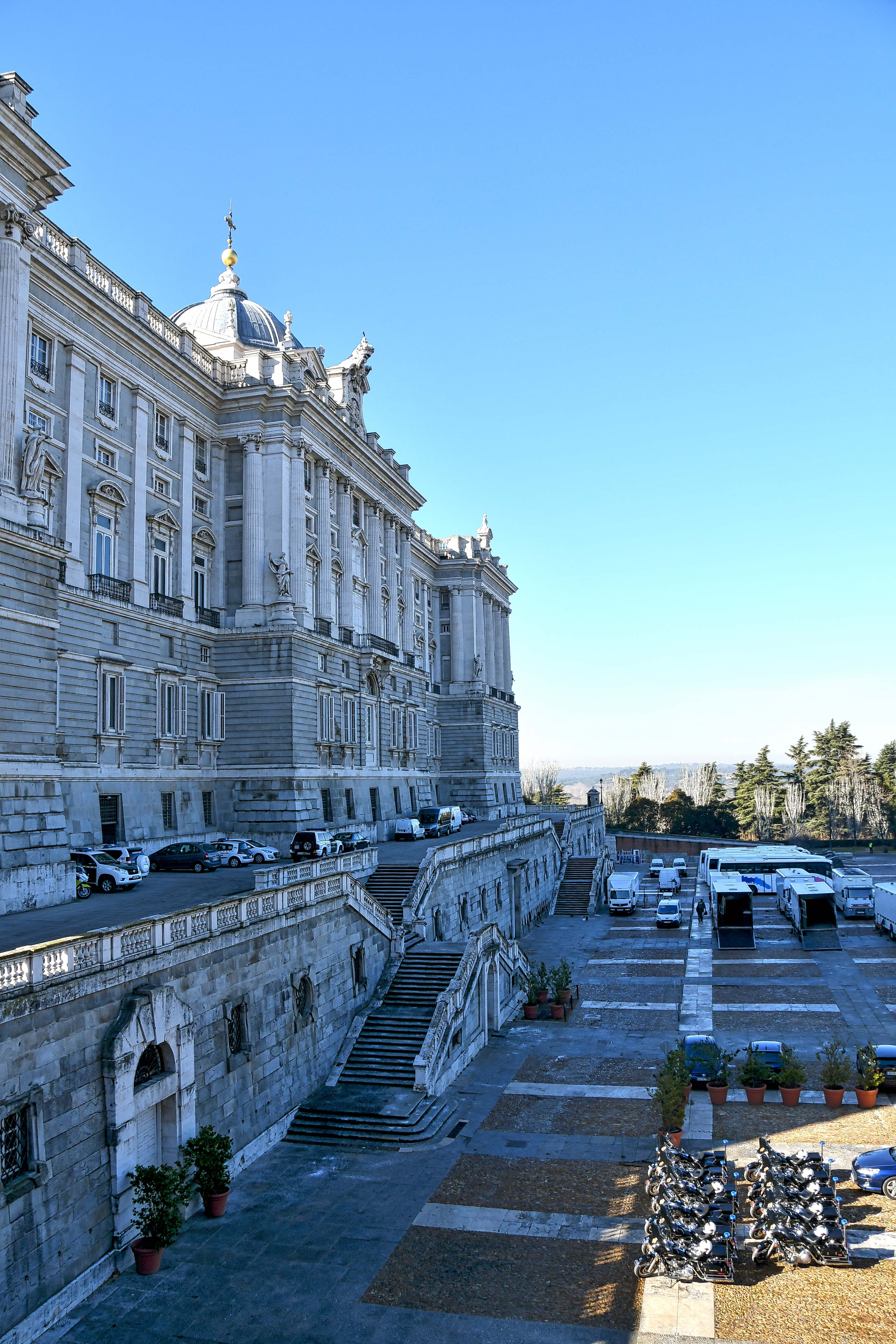 The official residence of the Spanish Royal Family is used only for state affairs. The Family resides at the Palace of Zarzuela located outside of Madrid. Because there was a state event occurring, the interior of the palace was not open to the public. We had to keep our distance from the building.