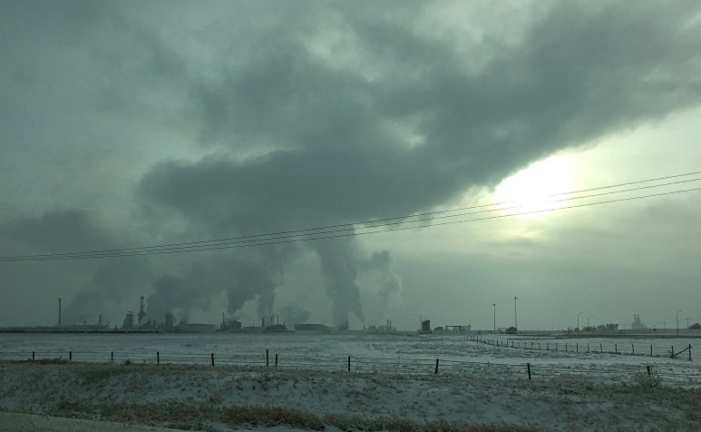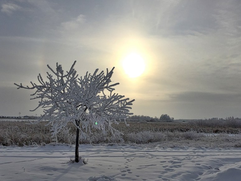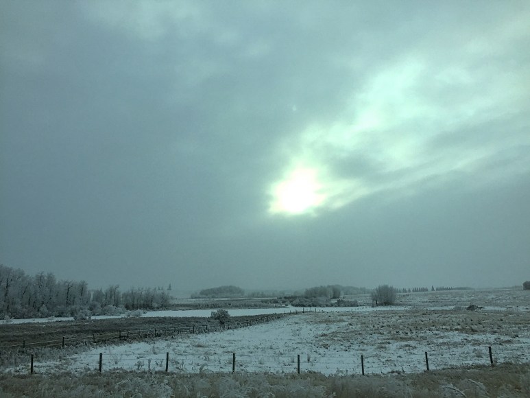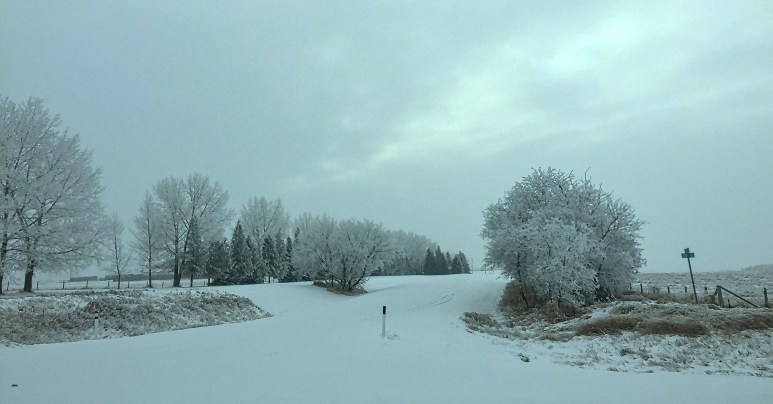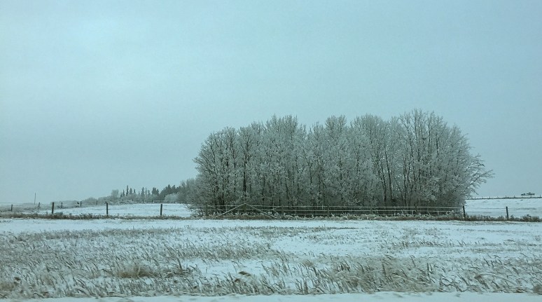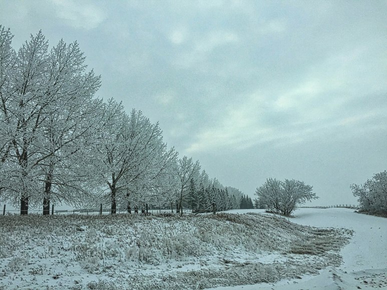 Road conditions on our recent return from Edmonton was fraught with icy patches brought on by thick fog. Looking at the landscape, you see all the frost clinging onto trees and whatever they can cling onto.