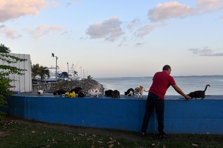 Feral cats get snacks from a kind animal lover