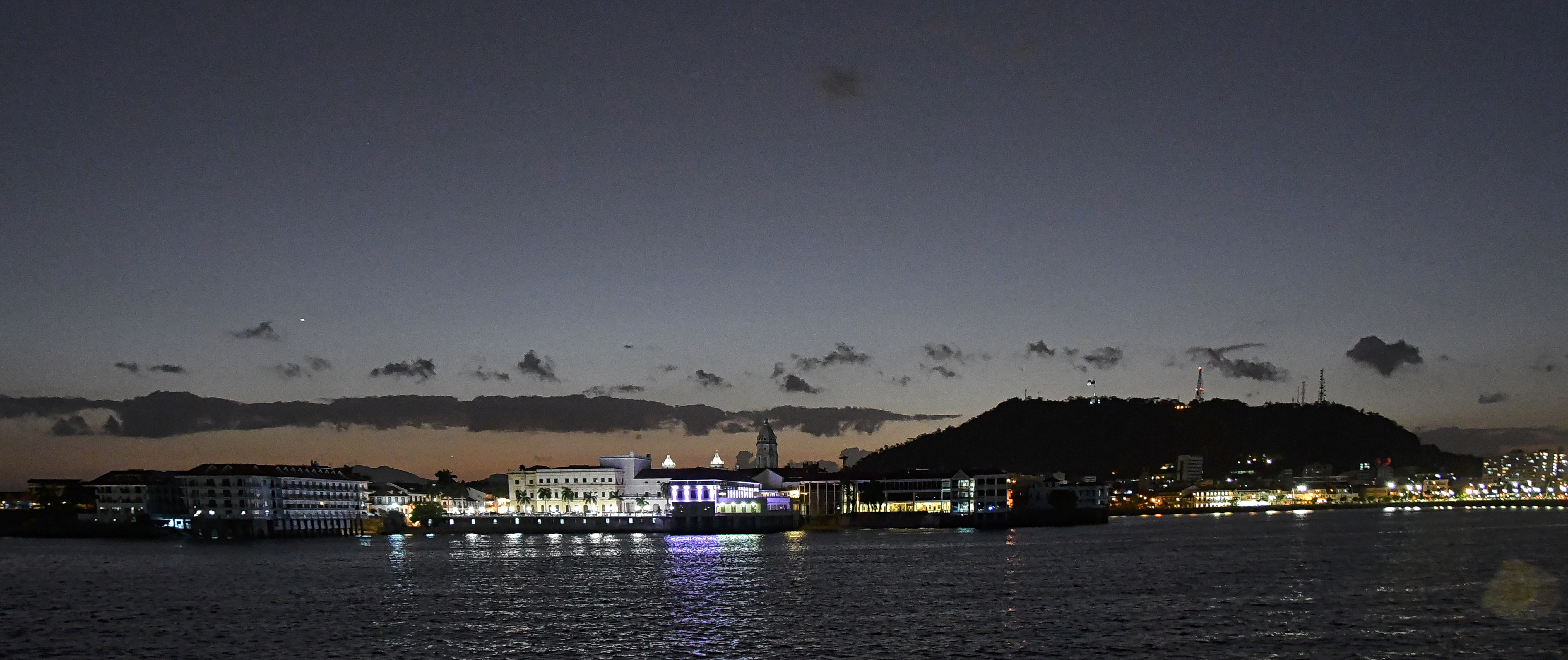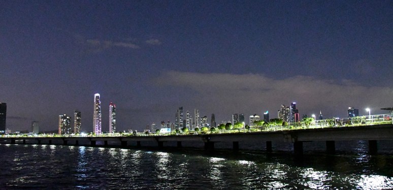 A couple of nights before, this view is taken from the point in Casco Viejo (see previous photo). The middle row of lights is the loop. The bottom row is a water reflection of the middle row. The top distant lights are from the Amador Causeway that takes you deeper into the bay.