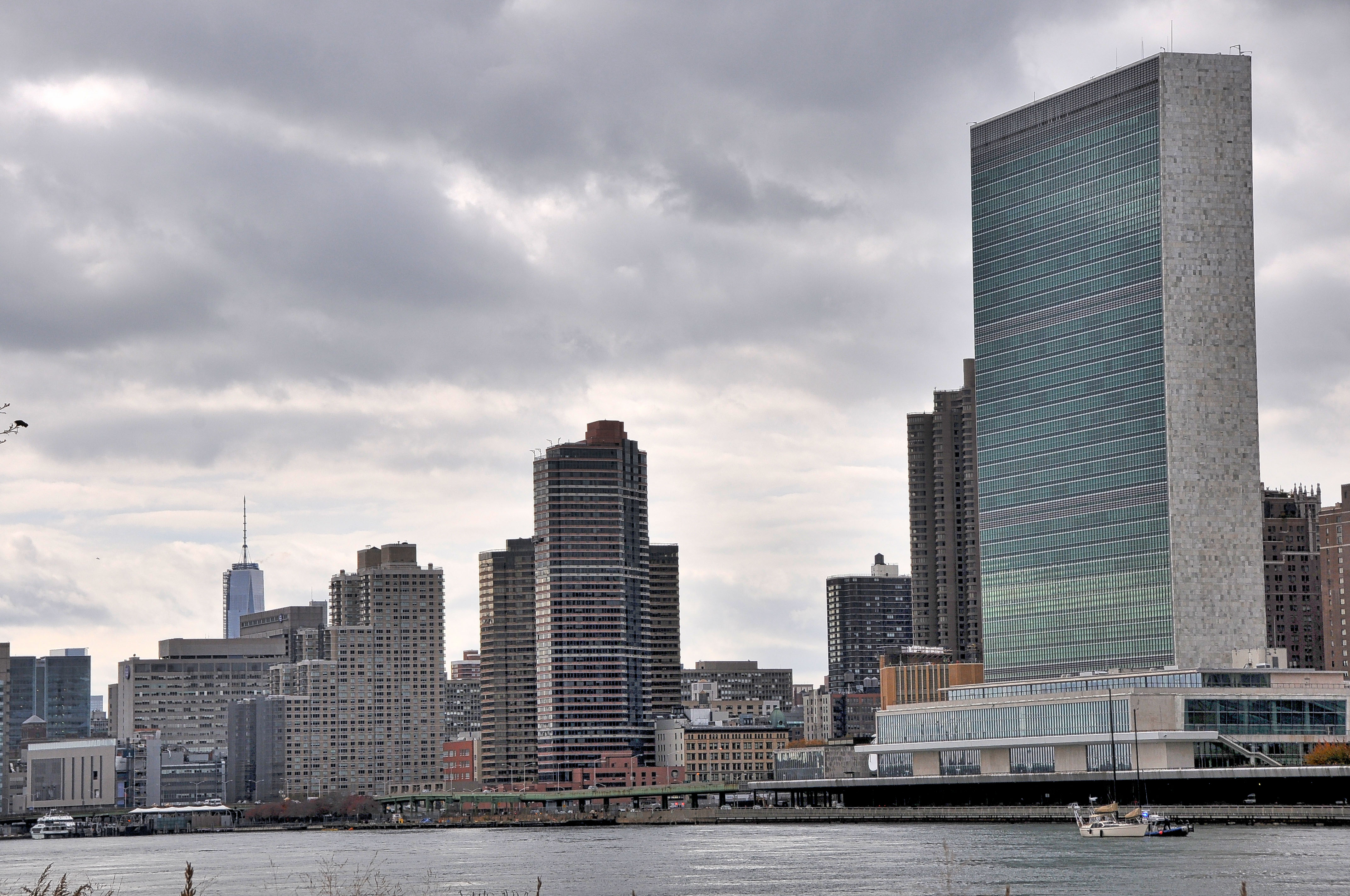 The UN Building. An unidentified boat is being checked by the River Patrol.